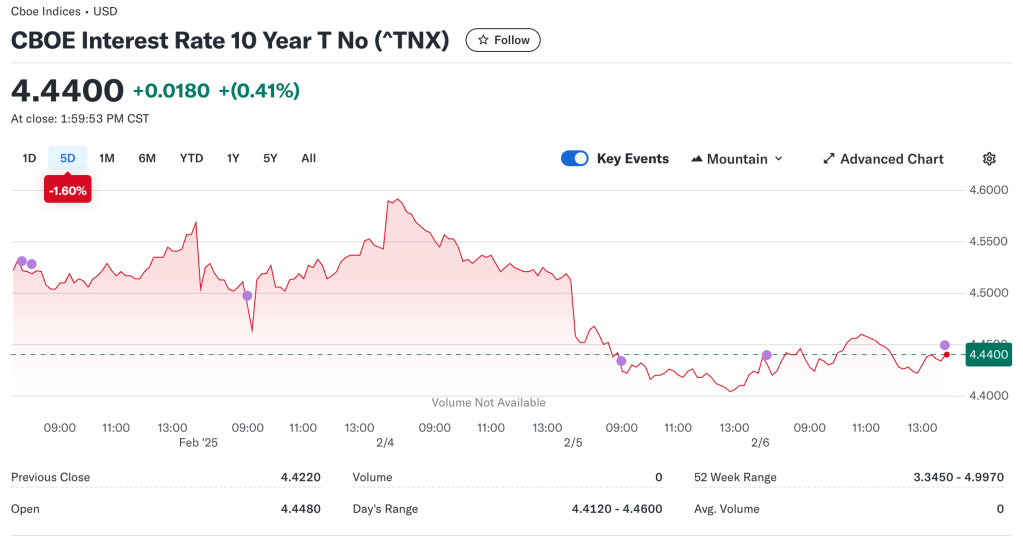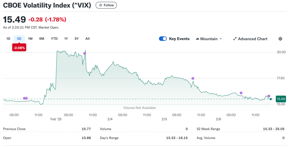 Okay, sweet. The proposed 25% tariffs on all Mexican and Canadian goods (with carve-outs for Canadian energy) were postponed by a month. This is undoubtedly good news. To Trump’s credit, he was able to get seeming concessions from our neighbors. He first called Mexican President Claudia Sheinbaum wherein she agreed to send thousands of troops to the border to help curb illegal immigration and the smuggling of fentanyl. In return, the US vowed to help limit the amount of guns funneling into Mexico. Similarly, Trump called Canadian Prime Minister Justin Trudeau striking a deal to delay the tariffs. Trudeau promised to “ensure 24/7 eyes on the border” (to deal with the ‘problem’ of fentanyl from the northern border) and pledged $1.3 billion to that end, as well as agreeing to a US-Canada joint strike force to tackle organized crime. The CBOE volatility index initially jumped slightly as we approached implementation but has since tapered off – so too have long-term interest rates. This reversion reflects the general sentiment of the situation – crisis averted, at least for now.